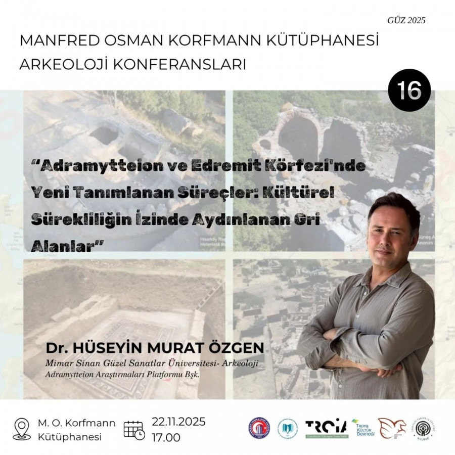 Çanakkale Onsekiz Mart Üniversitesi İnsan ve Toplum Bilimleri Fakültesi Arkeoloji Bölümü, Vakfımız, Troya Kültür Derneği, Adramytteion Araştırmaları Başkanlığı ve ÇOMÜ İnsanlık Tarihi ve Kültürü Kulübü ortaklığında gerçekleştirilen Arkeoloji Konferansları dizisinin 16. etkinliği Dr. Hüseyin Murat Özgen tarafından “Adramytteion ve Edremit Körfezi'nde Yeni Tanımlanan Süreçler: Kültürel Sürekliliğin İzinde Aydınlanan Gri Alanlar” başlığı ile 22 Kasım 2025 Cumartesi günü 17.00 saatlerinde Manfred Osman Korfmann Kütüphanesi'nde gerçekleştirilecektir.